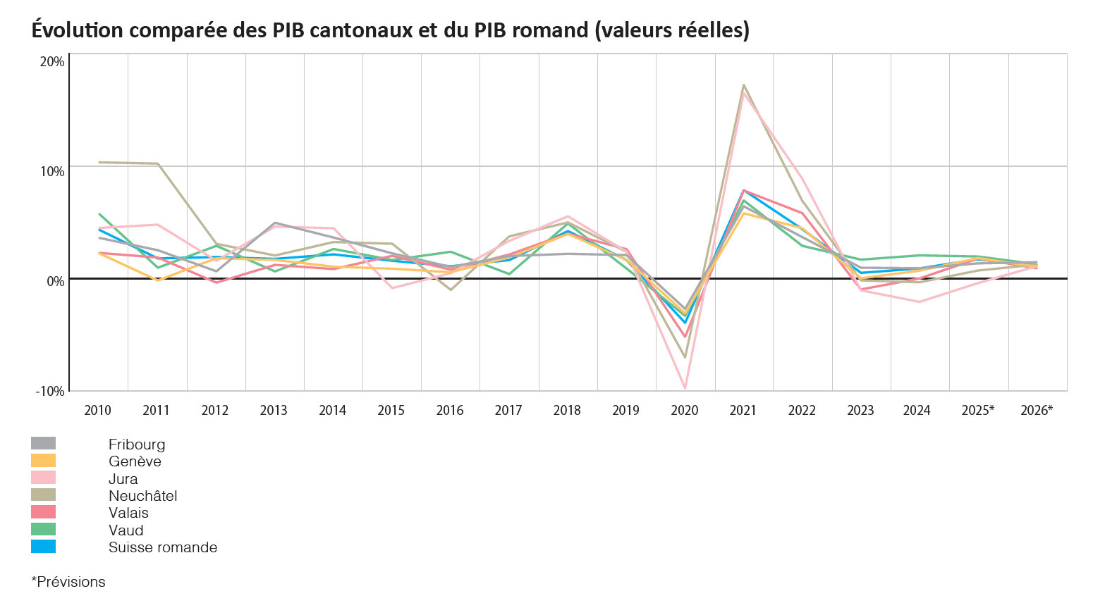 La Suisse et la Romandie ont fait preuve ces 20 dernière années de résilience, grâce à des produits à haute valeur ajoutée et à la robustesse de la demande intérieure. Leur ouverture internationale les expose toutefois aux aléas de la conjoncture mondiale et aux effets des politiques protectionnistes. L'économie romande est ainsi touchée de plein fouet par la nouvelle politique commerciale américaine. Après une hausse de son produit intérieur brut (PIB) attendue à 1,6% cette année, la croissance romande pourrait se replier à à 0,9% l'an prochain, selon une dynamique économique similaire à celle de la Suisse.